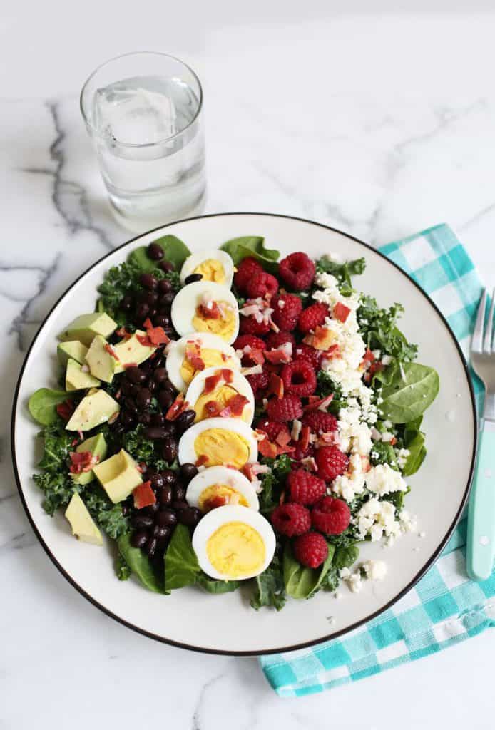 This cobb salad includes spinach, kale, hard boiled eggs, raspberries, black beans, avocados, feta, shallot, and facon. Oh yes, that isn’t a typo in the title. we’re using facon and we’re not sorry!