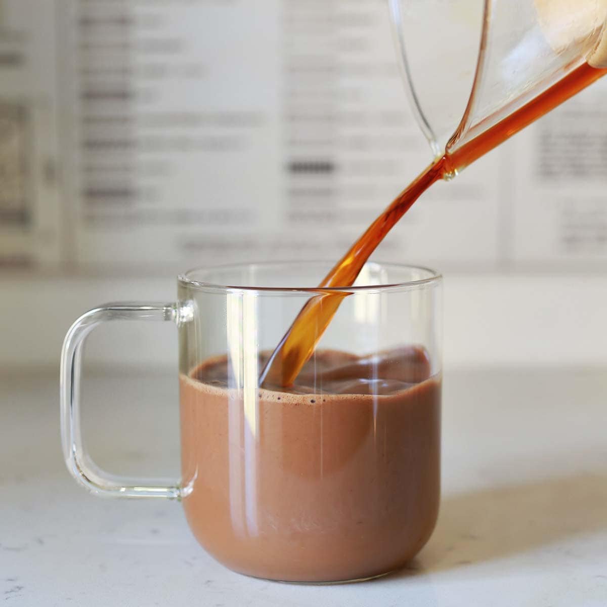 Mix together the brown sugar, cocoa, cinnamon, cayenne and milk. The goal is to dissolve the sugar and fully incorporate the other ingredients so no lumps remain. I think adding all the ingredients to a jar with a lid and shaking well works great, or you could use a small whisk or milk frothing wand.