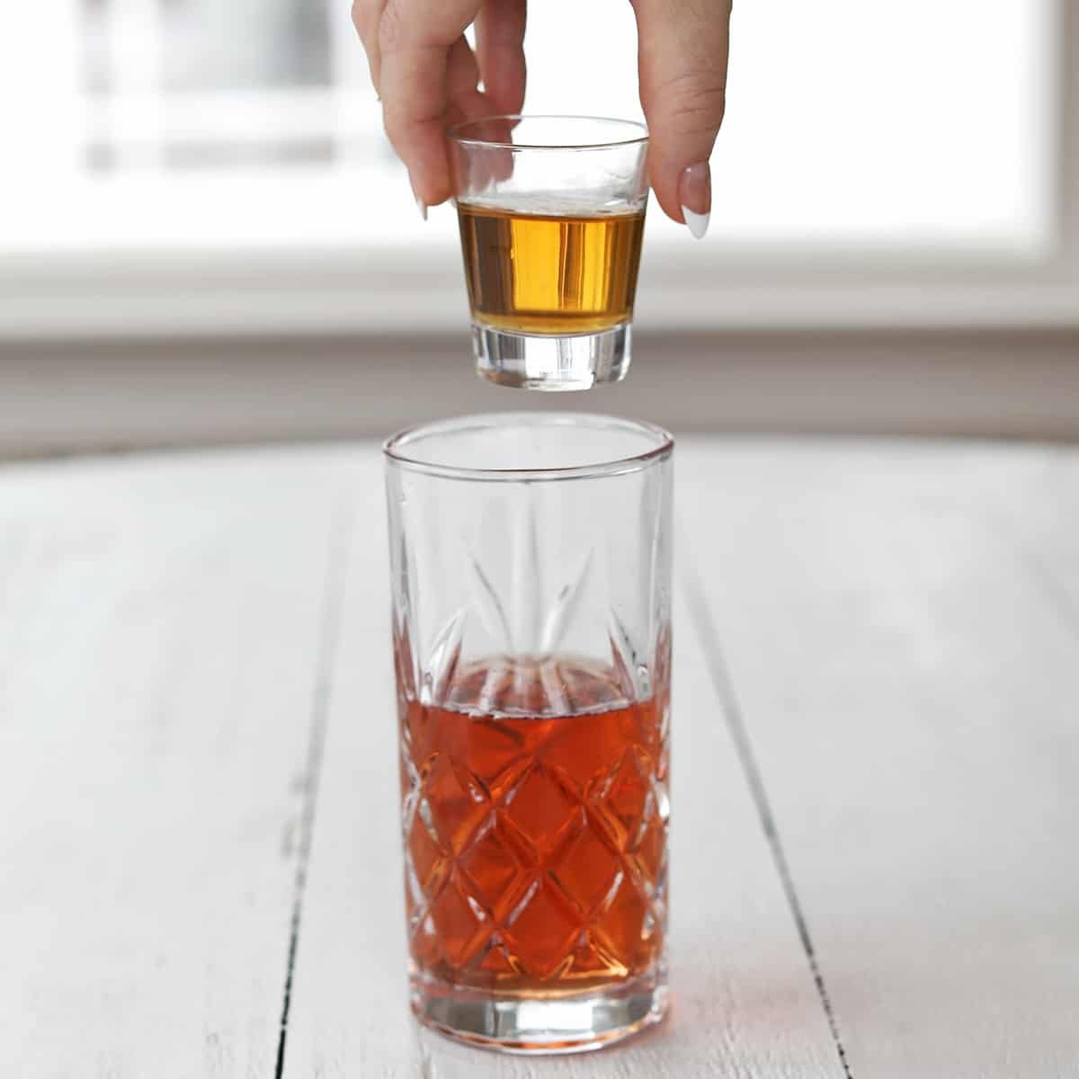 - Drink the two separately – If you don’t like the idea of a shot glass hiding inside your drinking glass (it hurts my teeth thinking about it too) or if you don’t love the big splash (bomb shots are a bit messy), an alternative way to enjoy this drink is to drink the shot before quickly chugging the second drink.